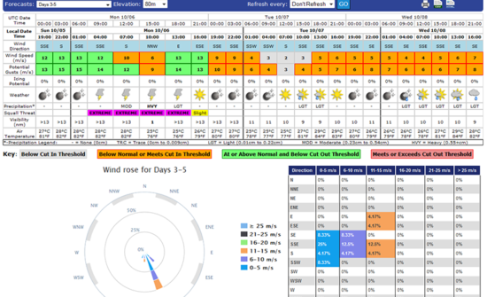 • Many parameters are provided, including: Squall Threat, Ramp Events, Cooling and Heating Demands, Icing Potential, Visibility for on site operations, and many more.
